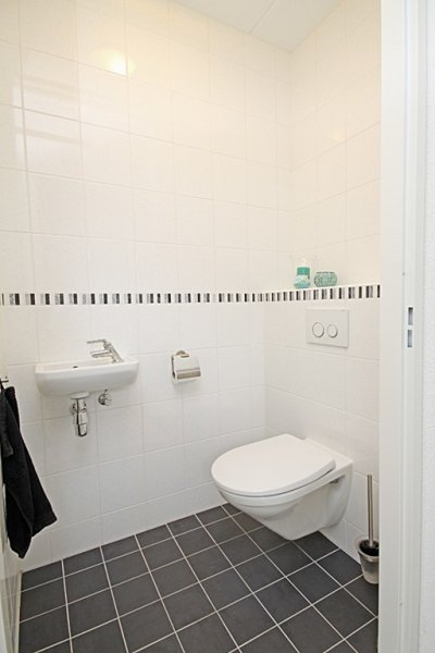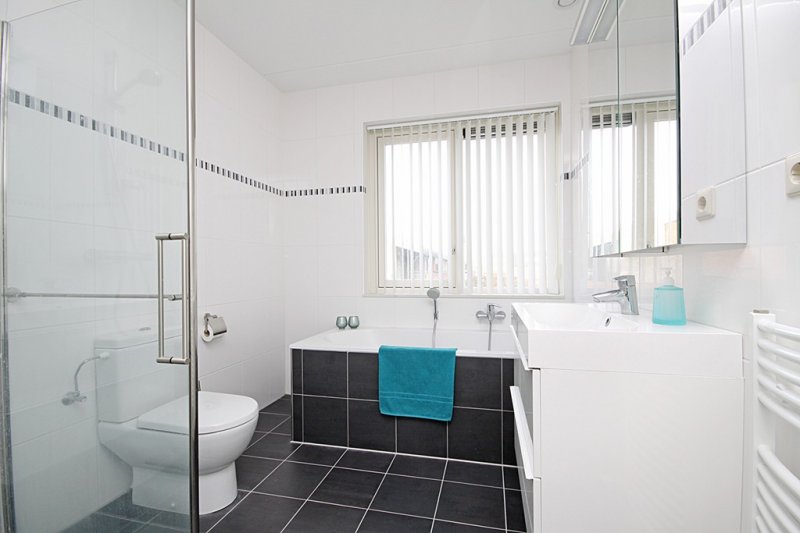 De moderne geheel betegelde badkamer (2,83m. x 2,34m.) is voorzien van een ligbad, douchecabine, badkamermeubel en 2e toilet.