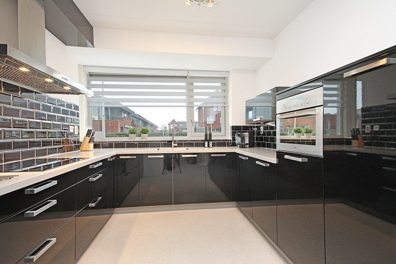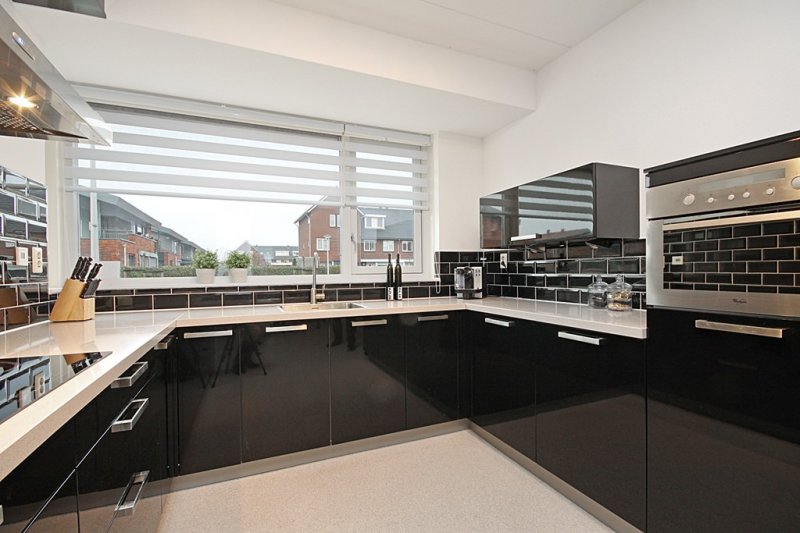 De moderne luxe hoogglans keuken (4,83m. x 2,95m./1,88m.) met natuurstenen aanrechtbladen is van alle gemakken voorzien: een vaatwasser, inductiekookplaat, RVS afzuigkap, combimagnetron, inbouwkoelkast- en vriezer (allen van het merk Whirlpool).